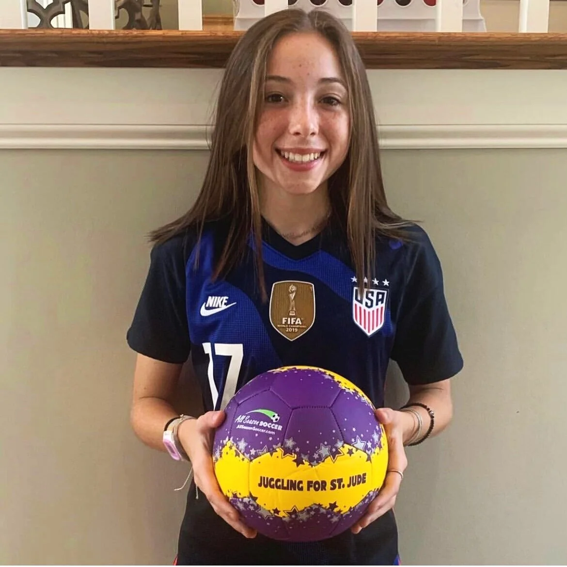 If you’re a regular reader of my blog, you know that what I love most about my work through the years is connecting with families affected by childhood cancer. I recently heard from Todd, dad to Ashlyn pictured in the photo above. He thanked me for my work and told me about Ashlyn’s strength, courage, and fight in overcoming cancer. He told me that she had recently celebrated three years of being cancer free! He also shared that she’s an avid soccer player and that her dedication to the sport has been a driving force in her recovery, which I loved hearing. I sent Ashlyn a Juggling for Jude soccer ball, and she sent back this great photo and a video of her super impressive soccer-juggling skills! You can watch her on my Instagram post with this same photo.